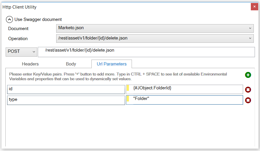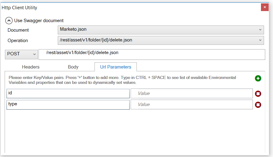 Alternatively, you can use the new Http Utility shape in the Process Designer. This HTTP Utility shape supports the selection of a Swagger document and then exposes a list of supported operations. Select the appropriate operation parameters from a drop-down list to set up the ESBMessage as shown below: