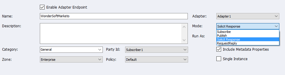 In Solicit Response mode, the adapter will listen for messages sent over the bus to the topic chosen and expect a response back from Marketo. The semantic should be request for the message subscribed from the bus. Marketo will automatically send back a response to the message containing information about the message such as error codes or the actual message body that was sent.