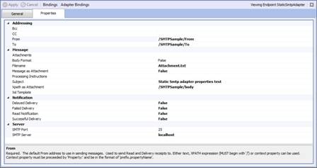 </SMTPSample>The adapter properties set for the DynamicAlertsSubscriber configure the adapter to use an XPATH expression to select part of the message body, and then transform that part using an XSL transform. Also configured are several other properties used to format and send the email: